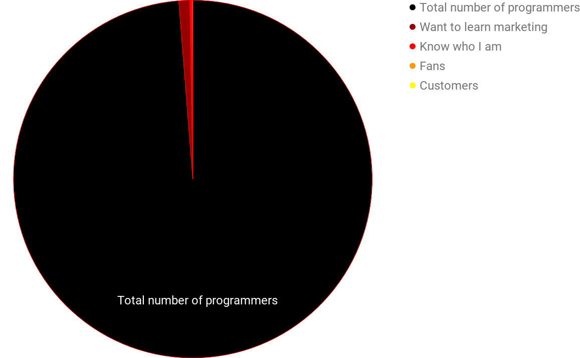 @tylertringas Yes, one example there was the "marketing for devs" market. "Programmers" is a huge market, but the % who want to learn marketing is (comparatively) tiny. And the % who wanted to learn marketing from me was tinier still. 😉