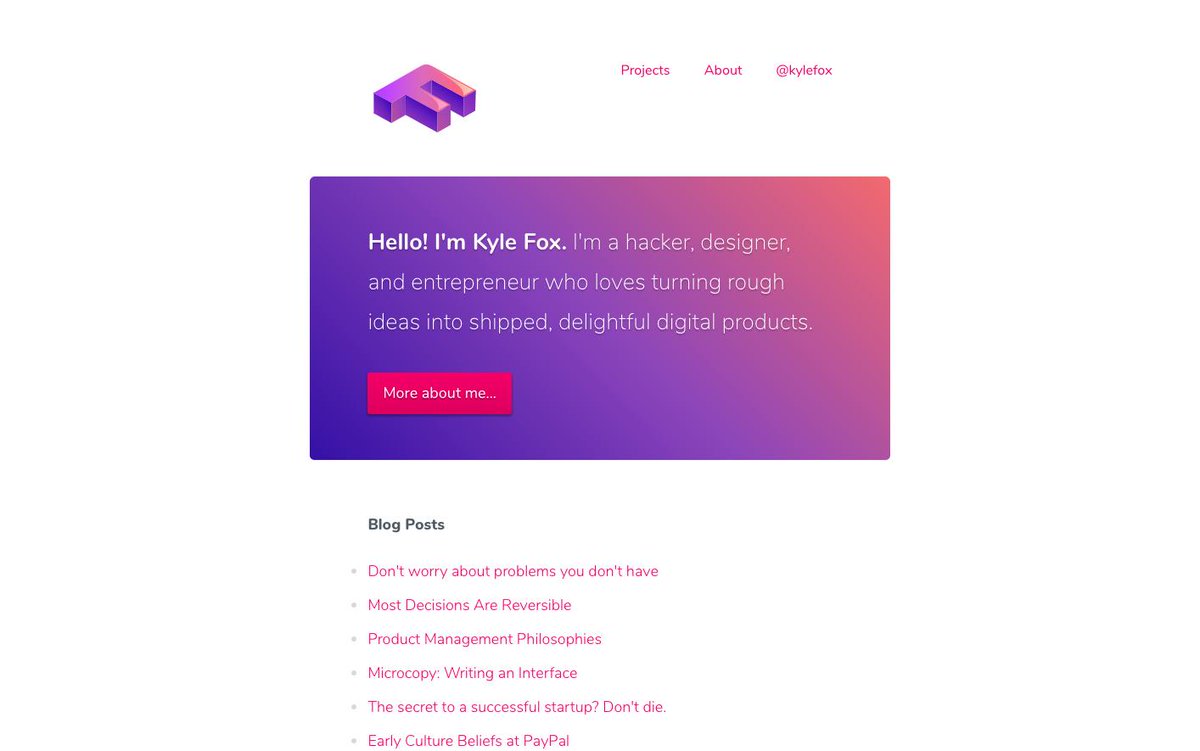 Justin Jackson@mijustin Jul 3, 2019 Replying to @mijustin I've always been a bit jealous of @kylefox' style. 👌I love the simplicity:1. Here's who I am.2. Here's some of my writing. ⟳ 0 ♡ 15