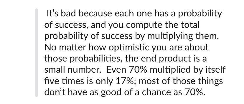Justin Jackson@mijustin Oct 9, 2019 Replying to @mijustin In it, he points out that the longer your list of “things that have to go right” the more likely it is you’ll fail. ⟳ 0 ♡ 5