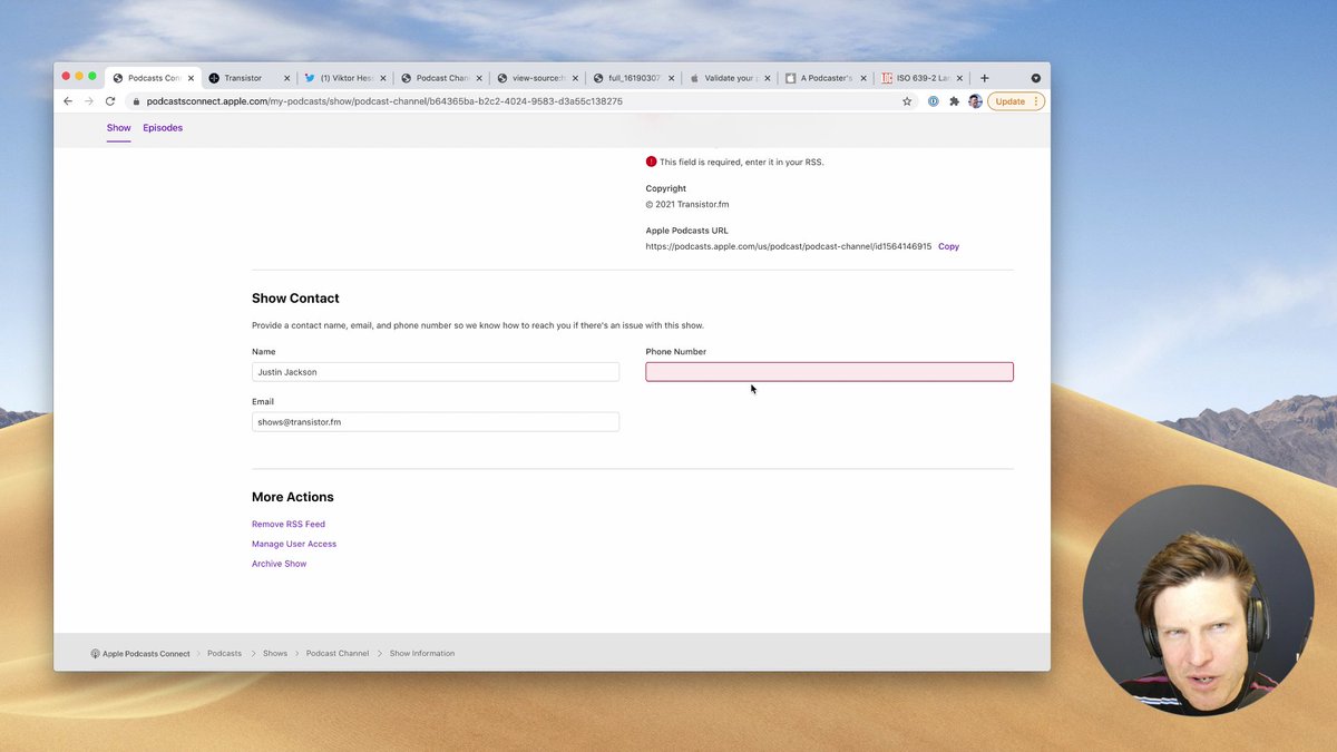 Justin Jackson@mijustin Apr 22, 2021 Replying to @mijustin WTF.You now need to enter your phone number to submit your show to Apple Podcasts?! ⟳ 0 ♡ 2