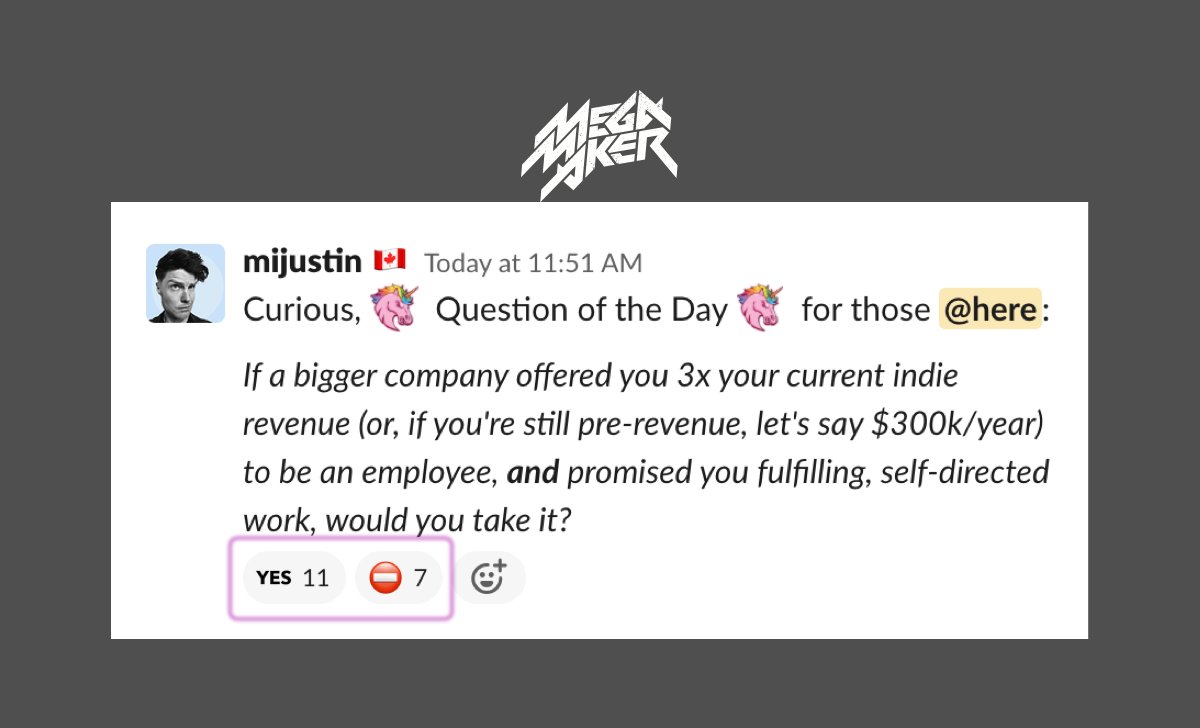Justin Jackson@mijustin Jun 16, 2021 Replying to @mijustin In the @megamaker community, 61% of indie makers say they'd take the job. ⟳ 0 ♡ 16