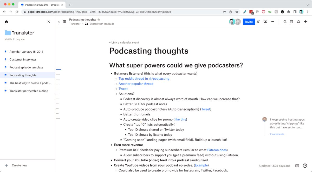 Justin Jackson@mijustin Aug 3, 2022 Replying to @mijustin Fast forward to late 2017: Jon and I started brainstorming ideas for podcast hosting.Here’s one of our early planning docs: ⟳ 0 ♡ 5