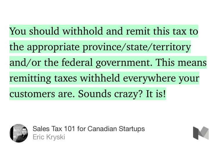 This guide by @ekryski is excellent: “Sales Tax 101 for Canadian Startups” @ekryski/sales-tax-101-for-canadian-startups-98d1a3df0bbe#---0-201.v8txh0vom" rel="noopener noreferrer">https://medium.com/@ekryski/sales-tax-101-for-canadian-startups-98d1a3df0bbe#---0-201.v8txh0vom
