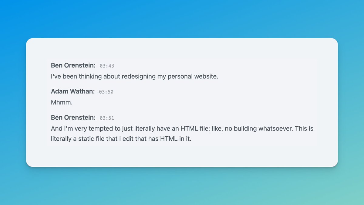 The most interesting part for me was @adamwathan and @r00k discussing the merits (and drawbacks) of having a simple personal website — just an index.html file you edit.