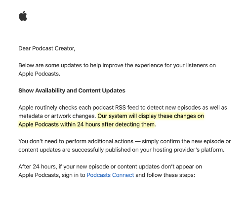 Back in January 2020 (even before this latest update), Apple announced that it could "up to 24 hours" for an episode to appear in the Apple Podcasts directory (and synced on mobile, desktop, web versions).