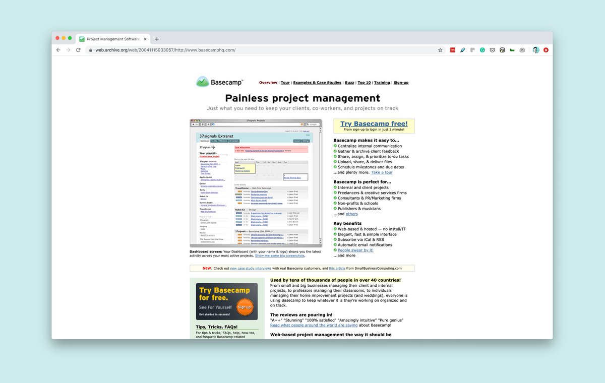 https://web.archive.org/web/20040204224142/http://www.basecamphq.com/But by July 2004, they'd switched to the more general "Painless project management" positioning.