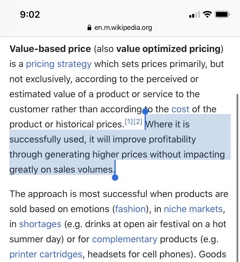 @morganandrewv The full Wikipedia definition points to the “profit maximizing” and “selling on emotion” nature of value-based pricing.