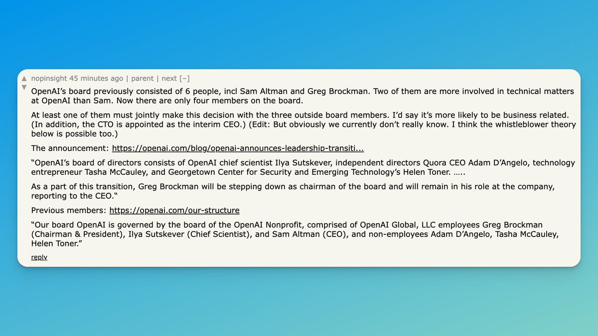 It explains the board’s behavior. It explains Microsoft’s continued commitment. And it explains why Sam seems resigned to the situation.