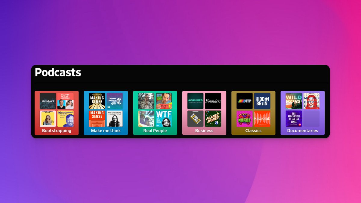 I currently have @pocketcasts organized around different categories.