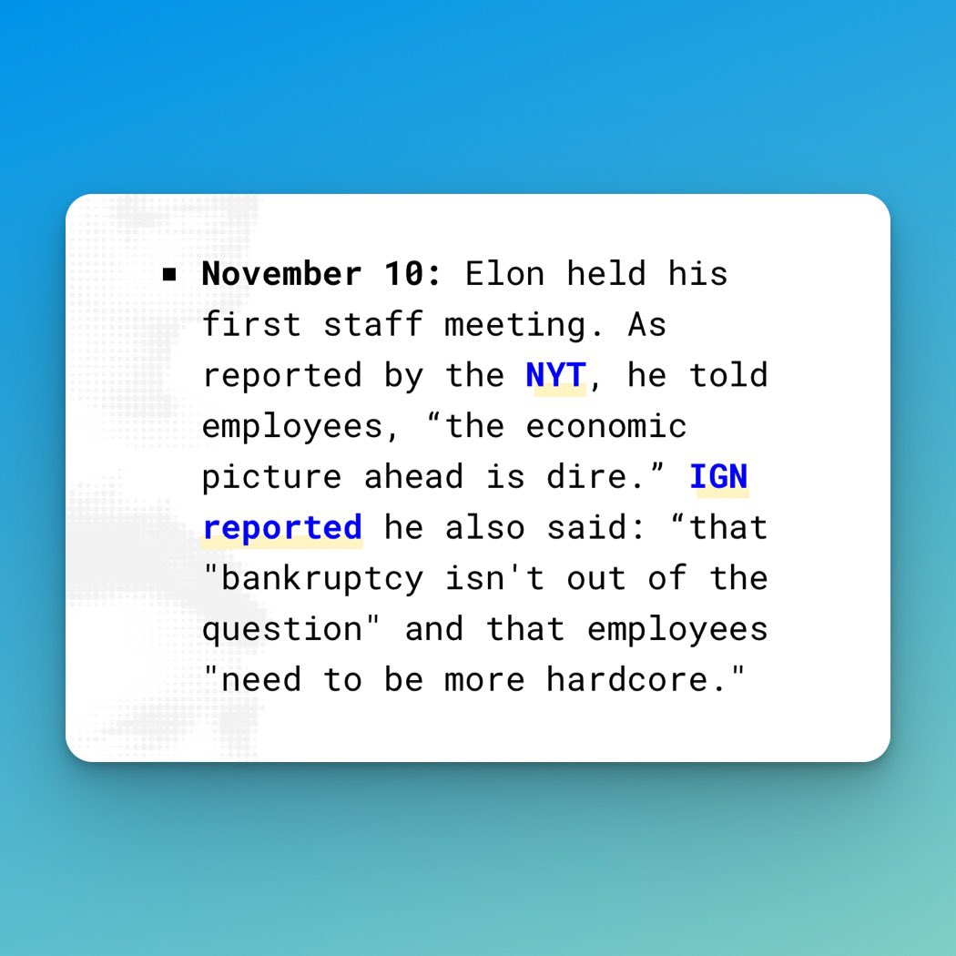 At his Nov 10 meeting (after layoffs) Elon told remaining employees that “the economic picture ahead is dire.”