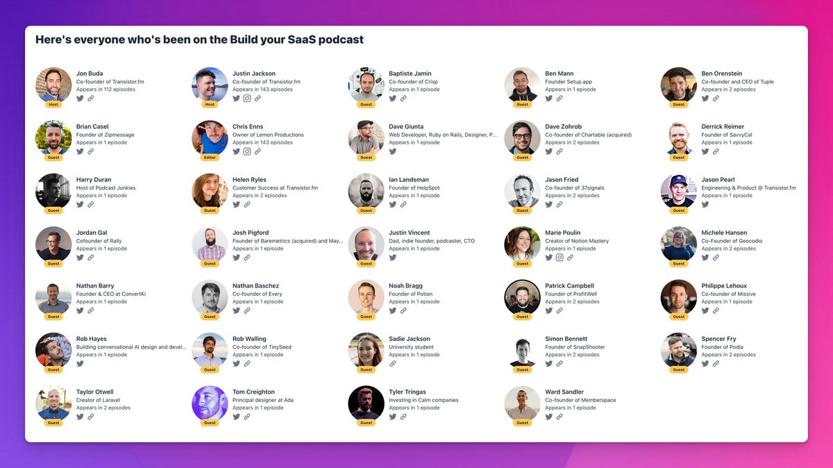 @buildyoursaas podcast and can't believe how many people have been on the show!
