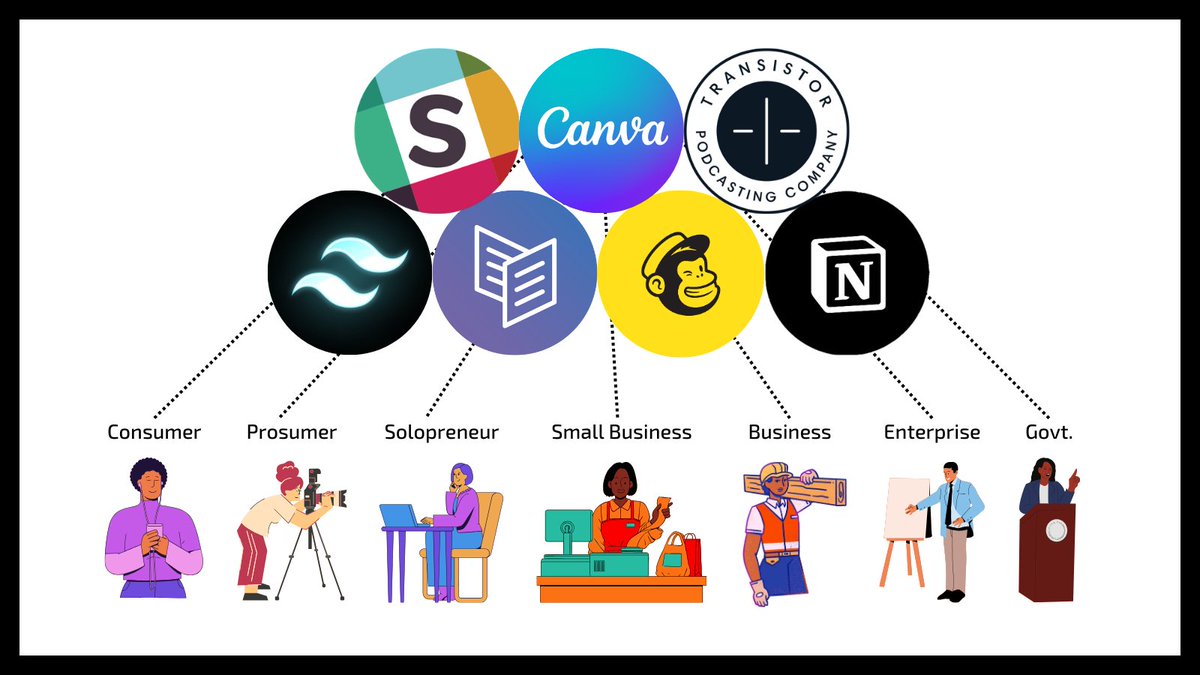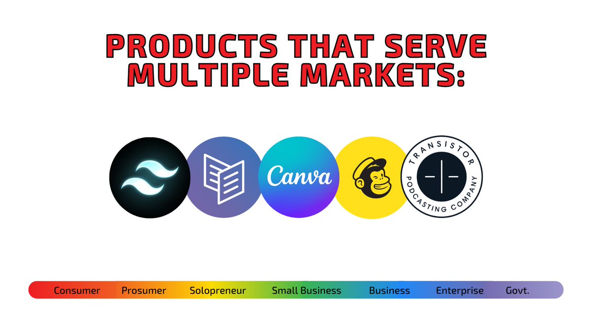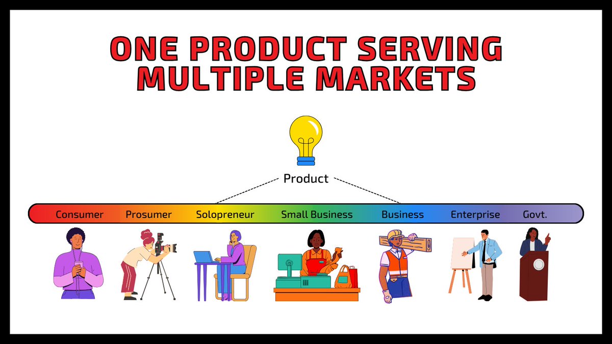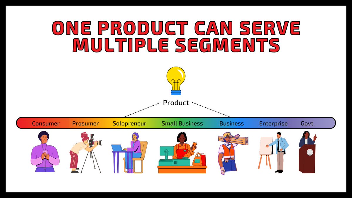 In reality, there is a spectrum of customer categories: Consumers, Prosumers, Solopreneurs, SMBs, Large businesses, Enterprises, Governments, and Non-Profits.