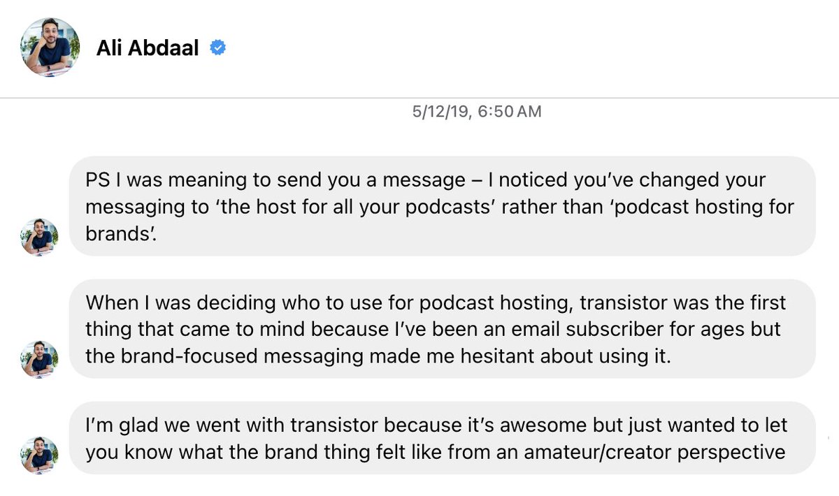 "When deciding who to use for podcast hosting," Ali said, "Transistor was the first thing that came to mind, but the business-focused messaging made me hesitant."