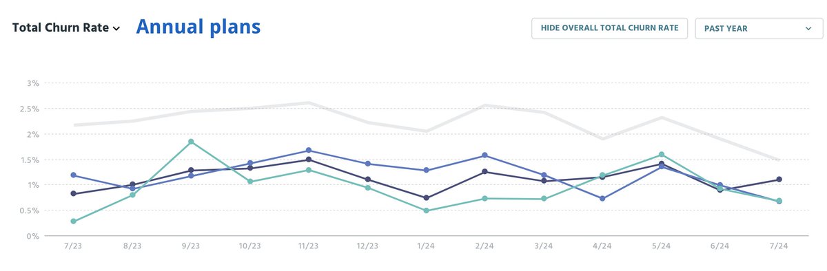 When you look at annual plans, the churn rate for the lowest-priced plan ($190/year) is very close to that of higher-priced plans.