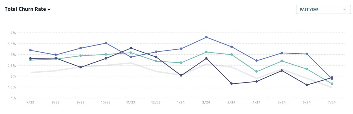 - Low churn (fluctuates between 1.9% - 2.6%)