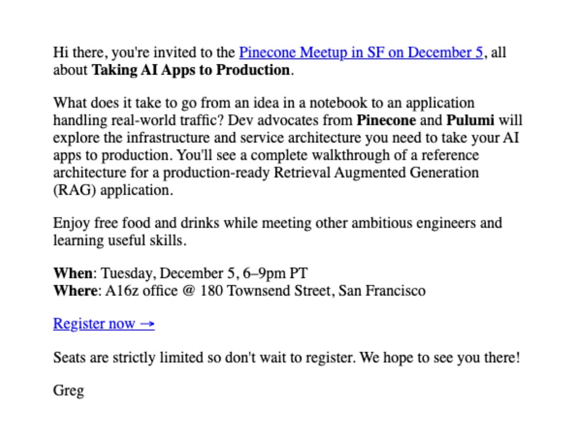 “The simple email with less stuff got 13% more opens, a bunch of replies vs zero replies, and the same clickthrough rate (% of openers who clicked a link). It also took 30-50% less time to prepare, and is a lot easier to replicate.”