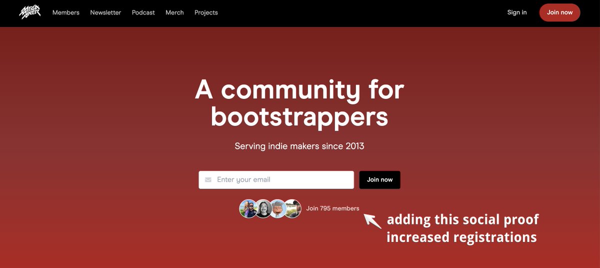 - with @megamaker, I found I got a lot more members when I switched from annual pricing ($199/yr) to lifetime $299) - also, when we added this bit of social proof ("join 795 members") to the CTA, signups 📈