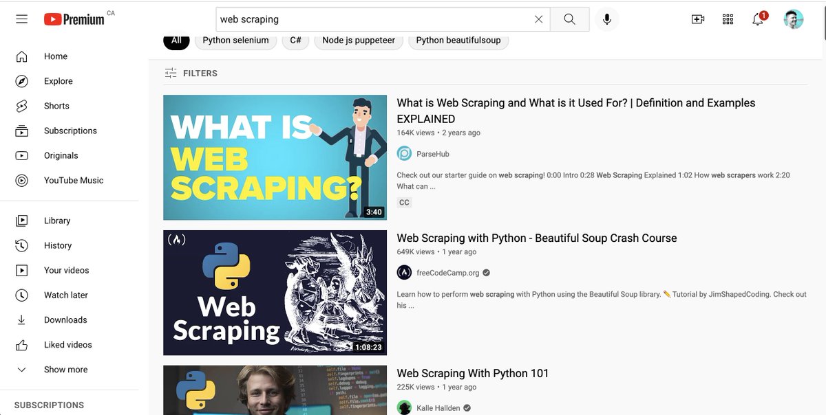 1. Search "web scraping" on YouTube. 2. Look at suggested queries 3. Record and publish a video for each query 4. Transcribe each video and turn it into a blog post