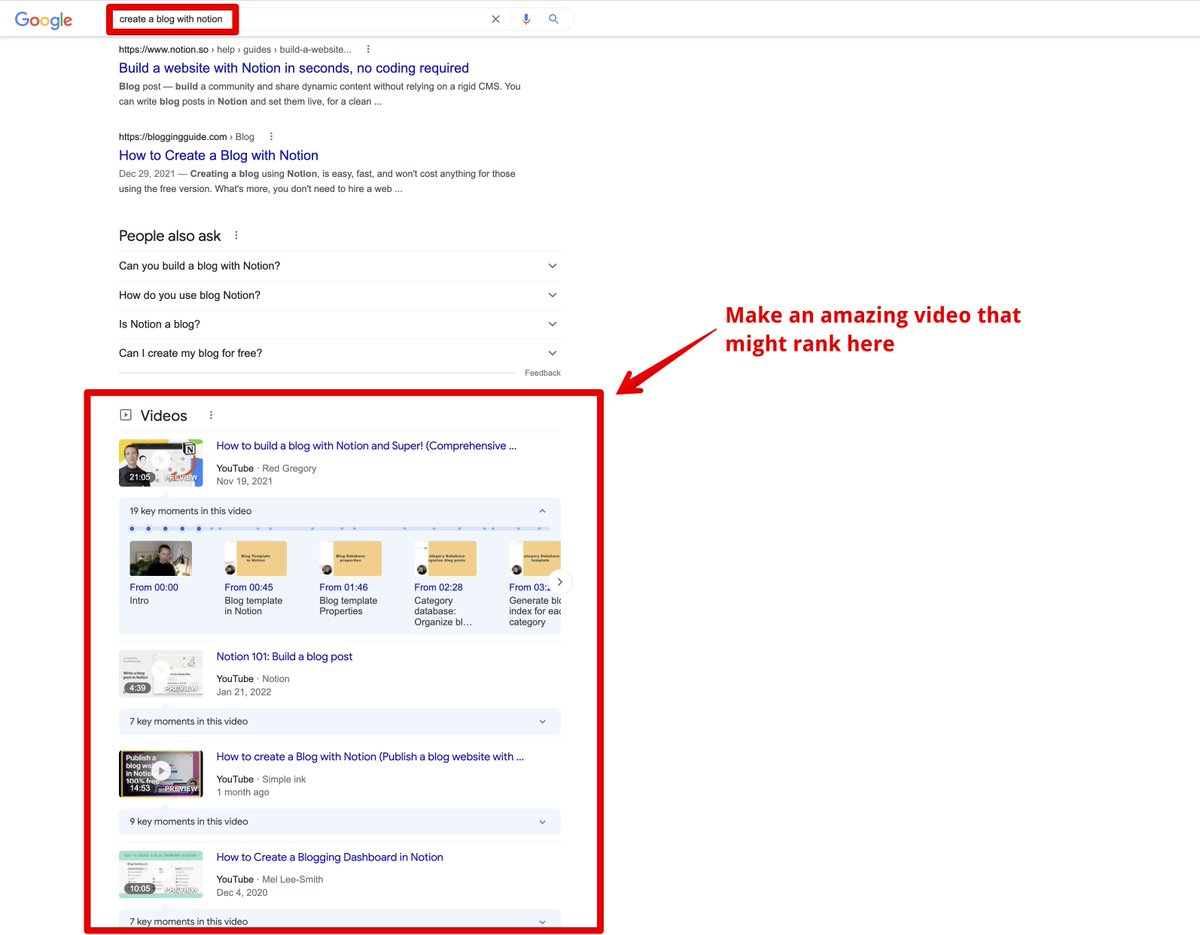 1. Make a video called "Create a blog with Notion in 2022" 2. Upload it to YouTube, and optimize the thumbnail, description, add chapters, etc... (Use TubeBuddy for this) 3. Transcribe it and turn it into an awesome blog post