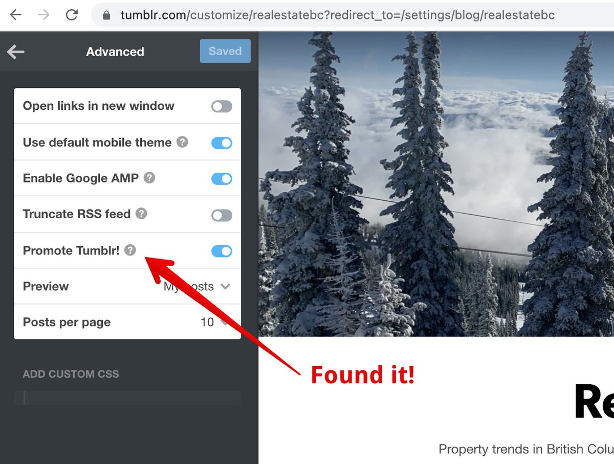1. In Tumblr Dashboard, click on the Account → Edit Appearance 2. Click on Edit Theme button (same Customize) 3. Scroll to the button and click Advanced Settings 4. Uncheck "Promote Tumblr!"