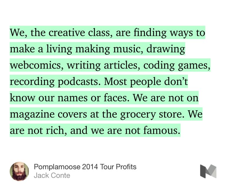 Love this line by @jackconte. ‘We have not “made it.” We’re making it.’ @jackconte/pomplamoose-2014-tour-profits-67435851ba37#---0-277.tmtz89yqt" rel="noopener noreferrer">https://medium.com/@jackconte/pomplamoose-2014-tour-profits-67435851ba37#---0-277.tmtz89yqt