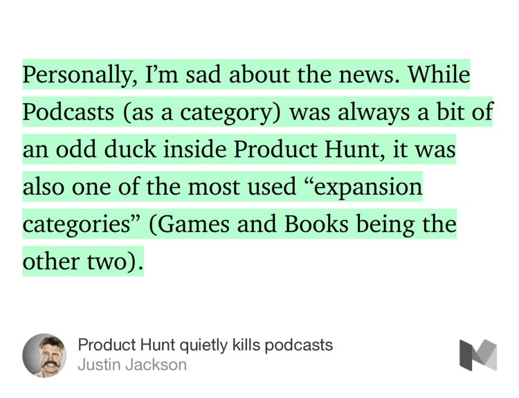 “Product Hunt quietly kills podcasts” @mijustin/product-hunt-quietly-kills-podcasts-a97bb08ed4d6#---0-214.x3g23vmsx" rel="noopener noreferrer">https://medium.com/@mijustin/product-hunt-quietly-kills-podcasts-a97bb08ed4d6#---0-214.x3g23vmsx
