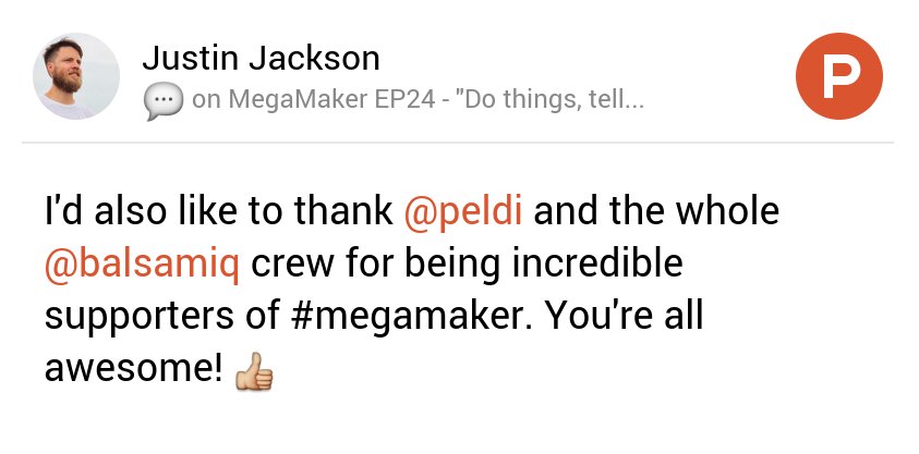 My thoughts on MegaMaker EP24 - "Do things, tell people" on @ProductHunt cc @peldi@balsamiq#comment-284122" rel="noopener noreferrer">https://www.producthunt.com/podcasts/megamaker-ep24-do-things-tell-people#comment-284122