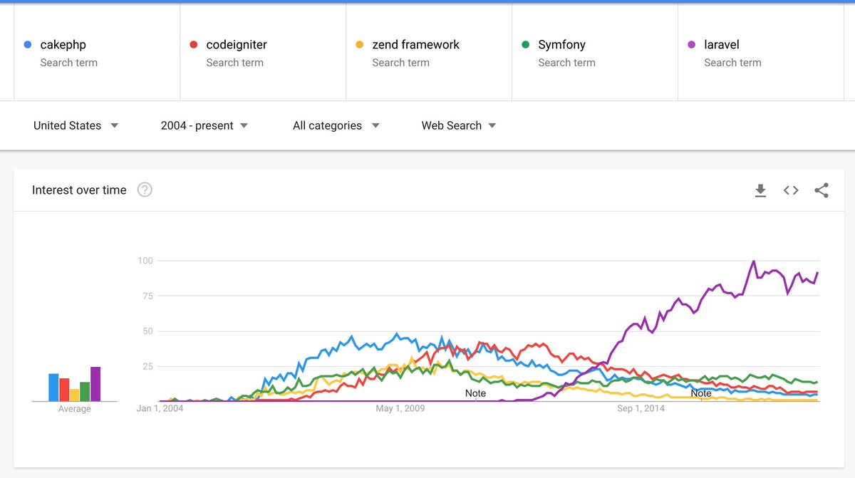 @philsturgeon It wasn't just CodeIgniter though. CakePHP, Zend, Yii - they're all active around the same time.