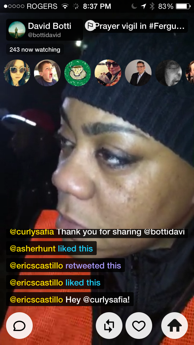 Justin Jackson@mijustin Mar 13, 2015 Replying to @bottidavid Watching @bottidavid live from #ferguson. http://mrk.tv/18gBFy3Finally seeing the potential of @AppMeerkat ⟳ 1 ♡ 3