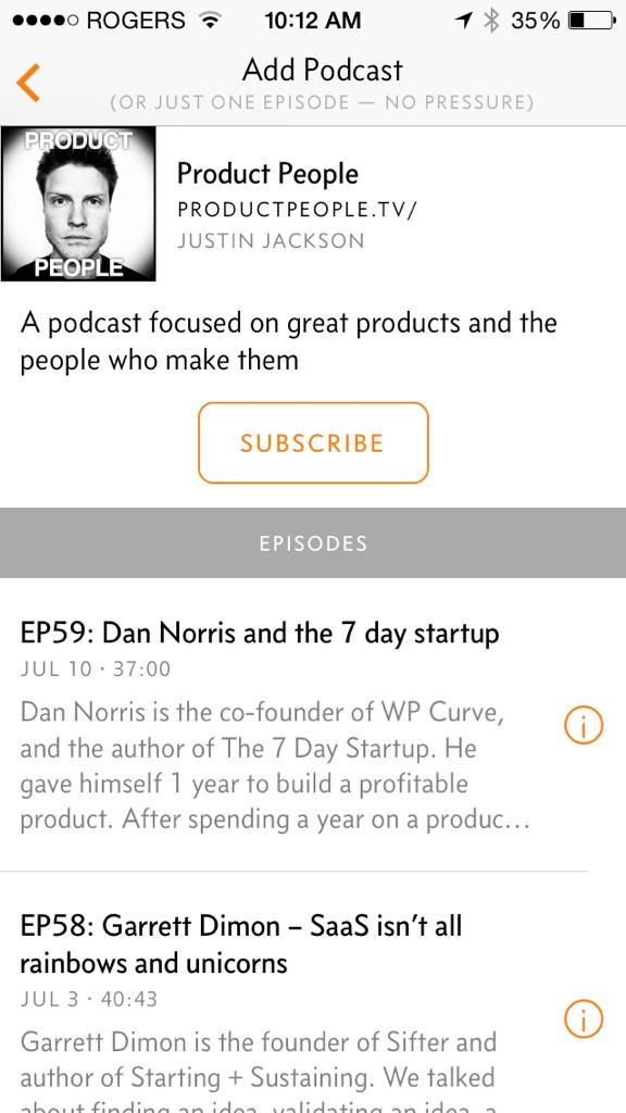 Justin Jackson@mijustin Jul 16, 2014 Hey folks, if you're downloading the new @OvercastFM app, be sure to subscribe to @productpeopletv! ⟳ 2 ♡ 3