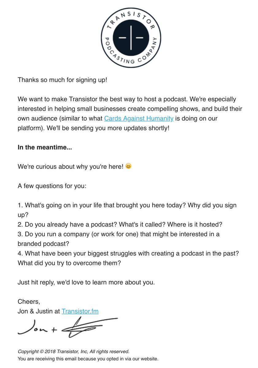 http://Transistor.fm:- Welcome: "What made you sign up?"