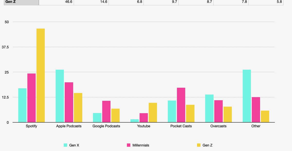 Follow-up: Gen Z dramatically prefers Spotify and YouTube for podcast listening (especially when compared to other generations).