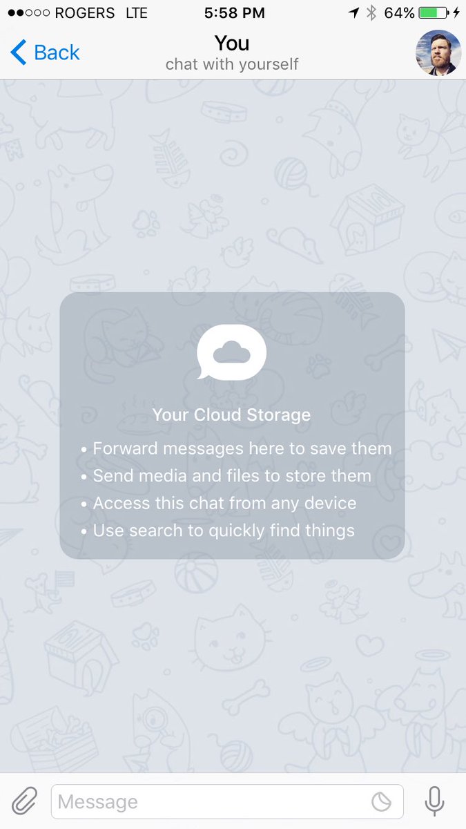 @telegram: chat with yourself! (Send yourself photos, etc so you can access them on different devices)