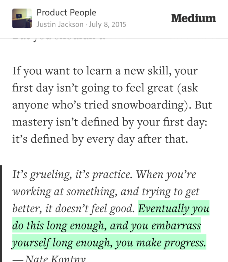 “If you embarrass yourself long enough you’ll make progress.” — @natekontny#dd6d--share-112-206" rel="noopener noreferrer">https://medium.com/product-people/you-always-feel-dumb-at-the-beginning-567e3fc0e153?source=tw-a02dd1574d08-1436485142013#dd6d--share-112-206